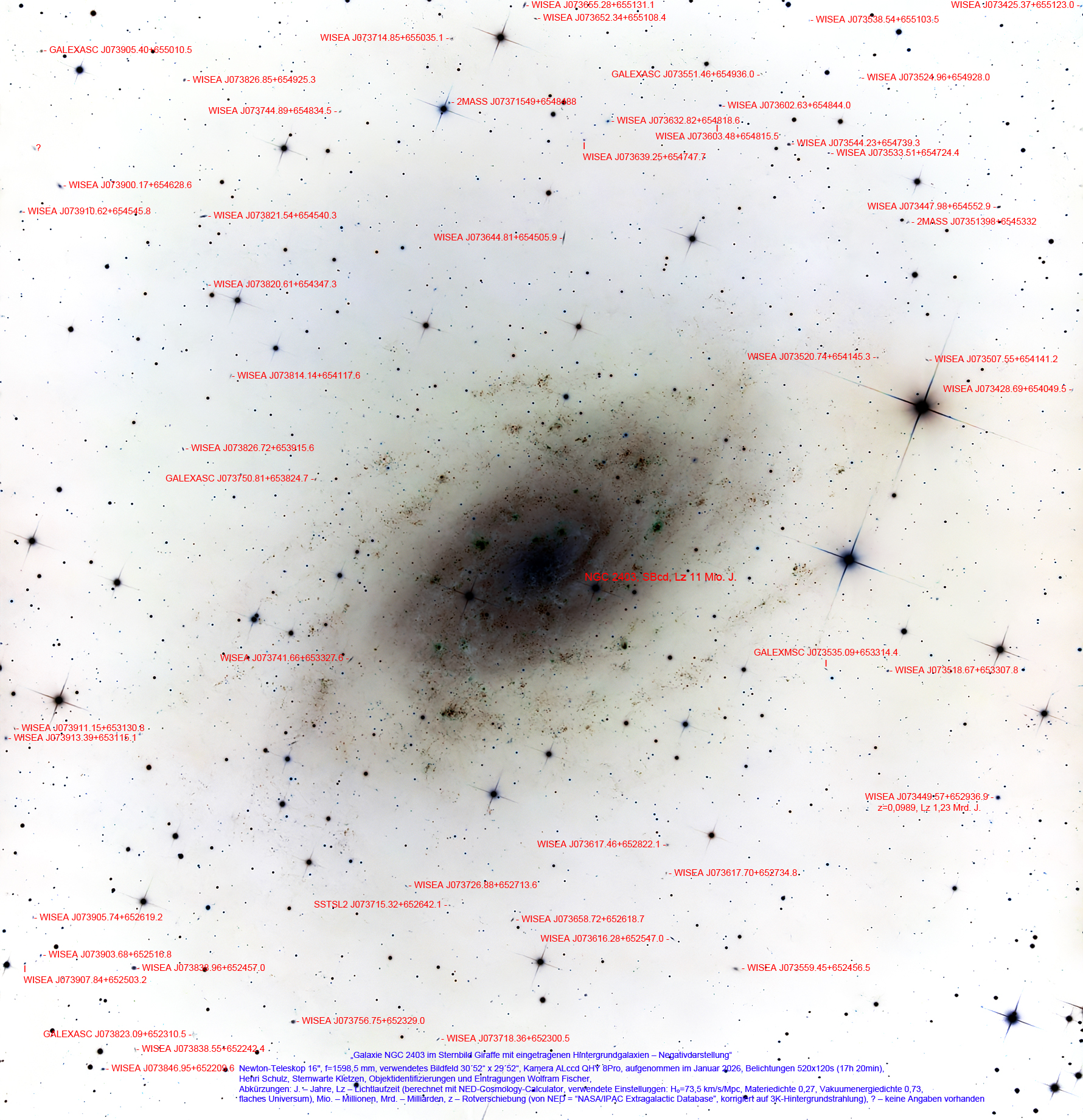 NGC: NGC 660, NGC 772, NGC 2403, NGC 4676A/B (Arp 242, Die Mäuse, the Mice, los ratones), NGC 5566, NGC 7331, NGC 7678, NGC 7753/52, NGC 7769, near the Cocoon Nebula IC 5146