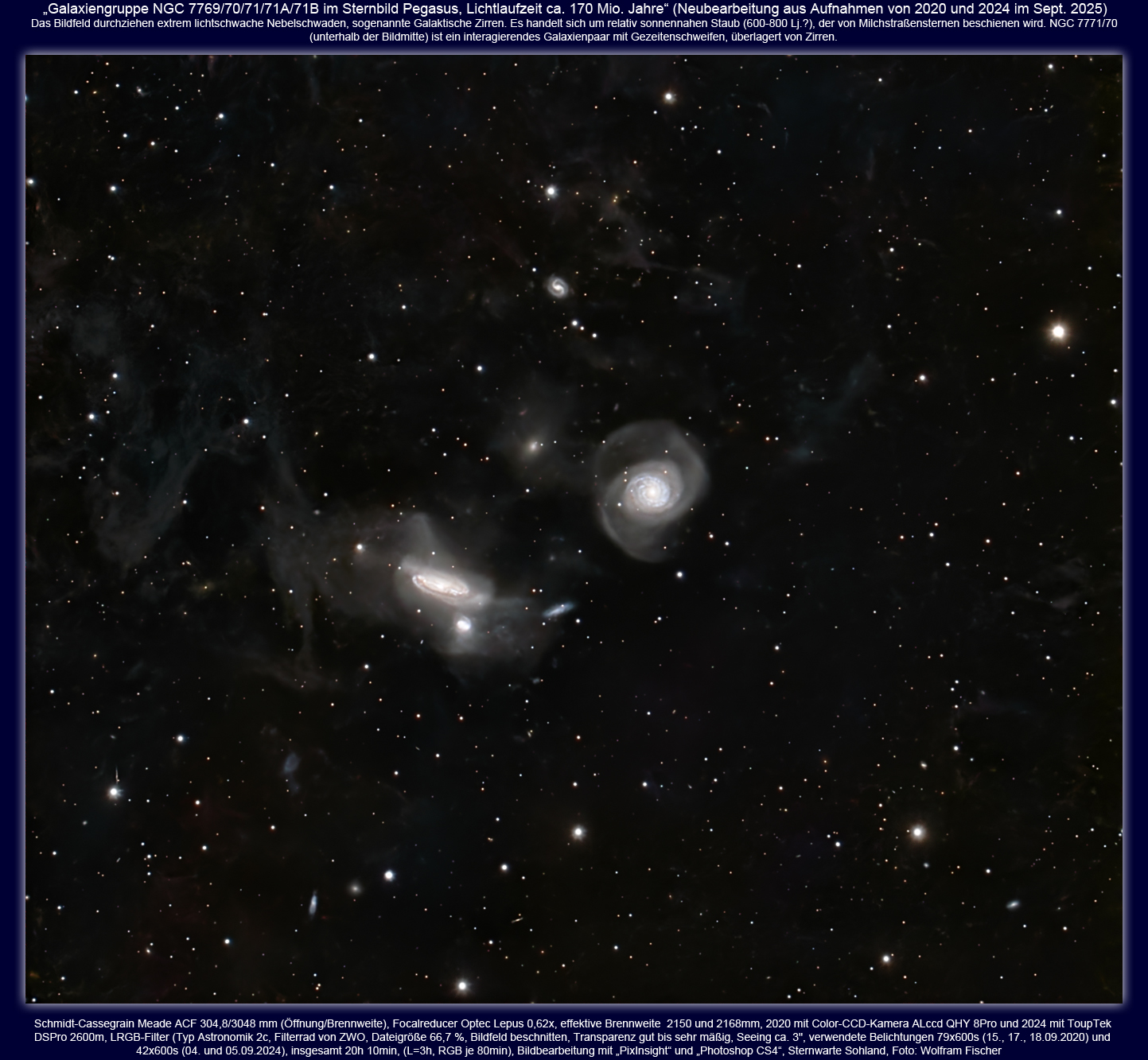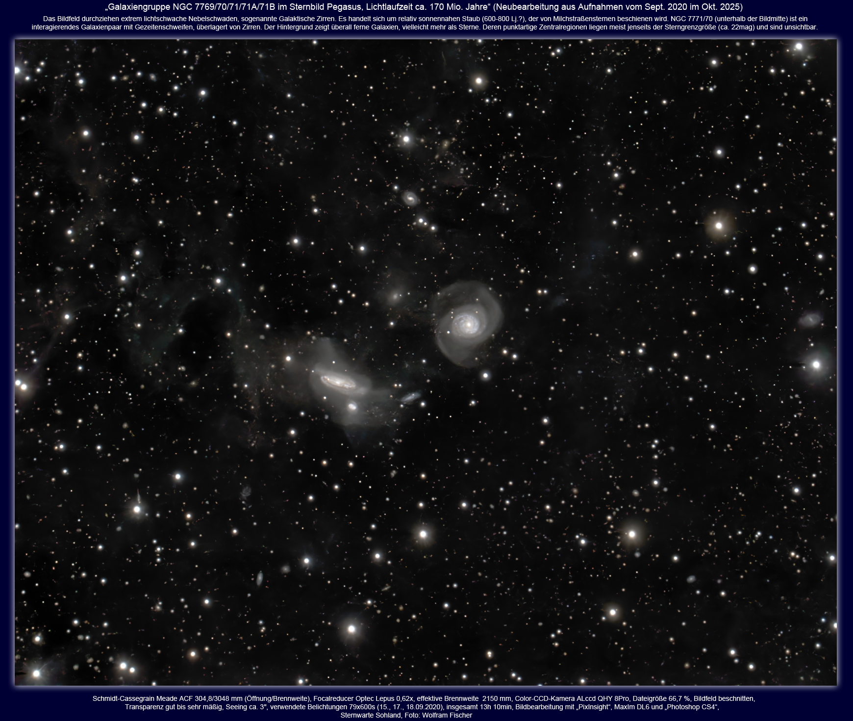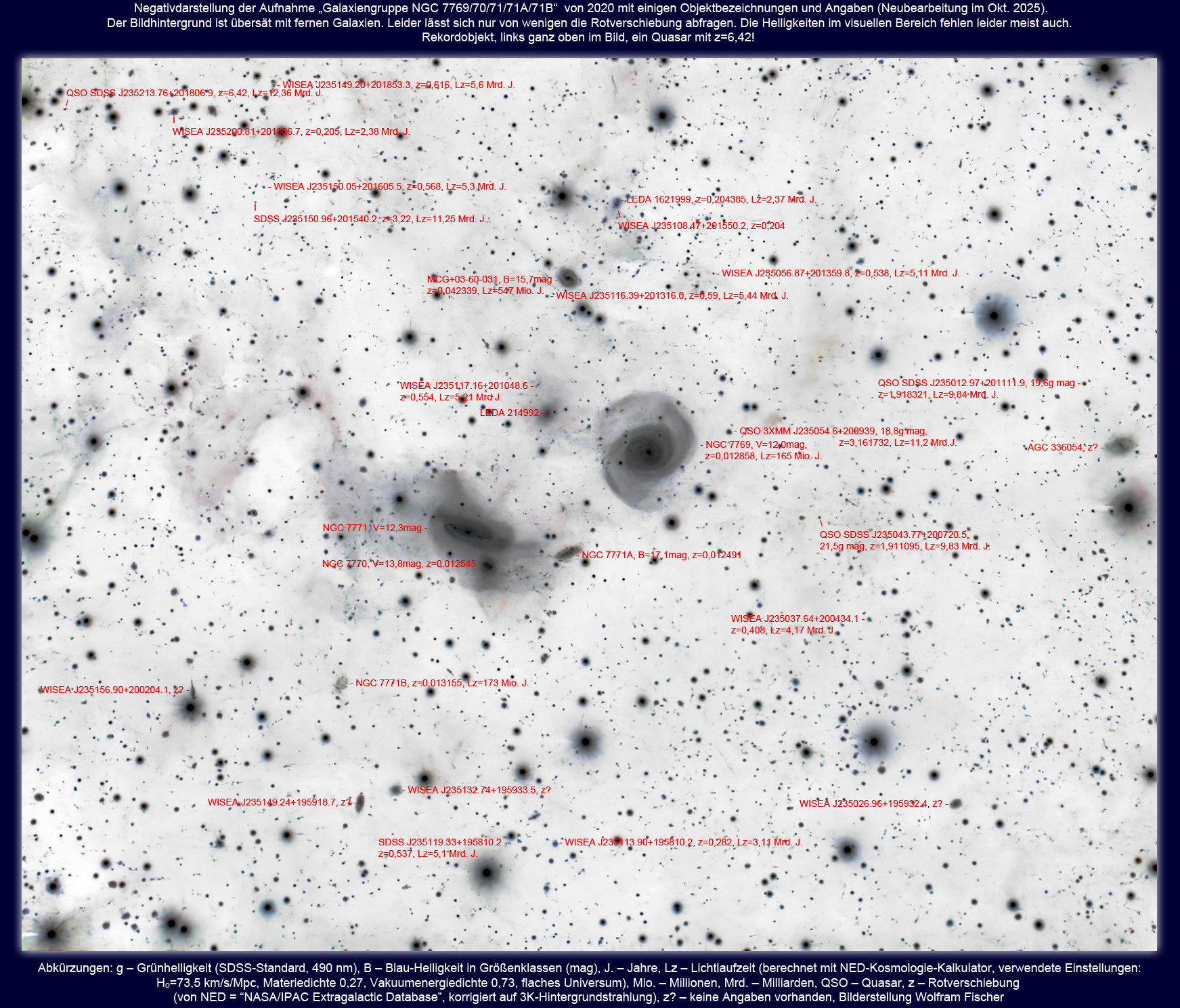 Eigentlich sollte die Neuerarbeitung meiner NGC 7769-Aufnahmen von 2020 und 2024 der praktischen Durchführung einer von Dr. Dewey vermittelten Bildverarbeitungsmethode mit PixInsight dienen. Es ging um die Vereinigung unterschiedlicher Aufnahmen (verschiedene Kameras, Bilder mit OSC und s/w LRGB, unterschiedlich große Pixel, leicht unterschiedliche Brennweiten, gegeneinander etwas verdreht). Es ging um insgesamt 20h 10min Belichtung. Das Ergebnis, hier danach gezeigt, war ansprechend, scharfe Sterne, weich gezeichnete deutliche Galaktische Zirren und helle Galaxien, angenehmer Farbraum. Dennoch war ich damit nicht wirklich glücklich, denn ich möchte stets auch das Schwächste und Fernste möglichst deutlich und autentisch zeigen. Einen Monat lang verstrickte ich mich damit in ein Dilemma. Alles in einem Bild zu vereinen erwies sich als schir unmöglich und ich benutzte schließlich nur noch die Aufnahmen von 2020. Ein Kampf mit und gegen die in PixInsight integrierten KI-Subprogramme, die es erst ermöglichen, ein Bild rauschlos extrem zu strecken. KI treffen aber zugleich Entscheidungen, auf die man wenig oder gar keinen Einfluss hat. Extrem gestreckt treten unglaublich schwache Objekte hervor, aber der Preis dafür sind aufgeblasene Sterne und weniger Farben. So bearbeitet ist das Bild kein pretty Picture, dennoch für mich viel interessanter. Mit den Datenbanken SIMBAD und NED konnte ich darauf (nah am leicht unscharfen Bildrand und durch Vignettierung geschwächt) einen Quasar mit z=6,42 nachweisen (siehe Negativbild). Und dabei ist das noch lange nicht das Schwächste, was man auf dem Bild erkennen kann.