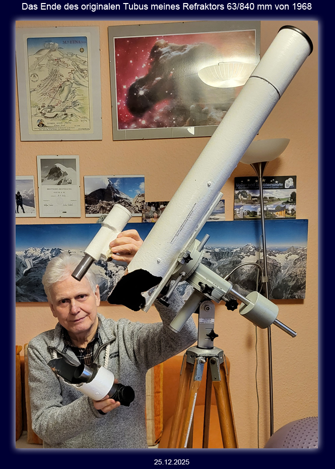 Am 1. Weihnachtsfeiertag verunglückte mein über 57 Jahre alter Refraktor AS 63/840 mm, mein erstes richtiges Fernrohr. Der originale Tubus lässt sich so nicht mehr retten. Zum Glück scheinen die Optiken unbeschädigt zu sein.