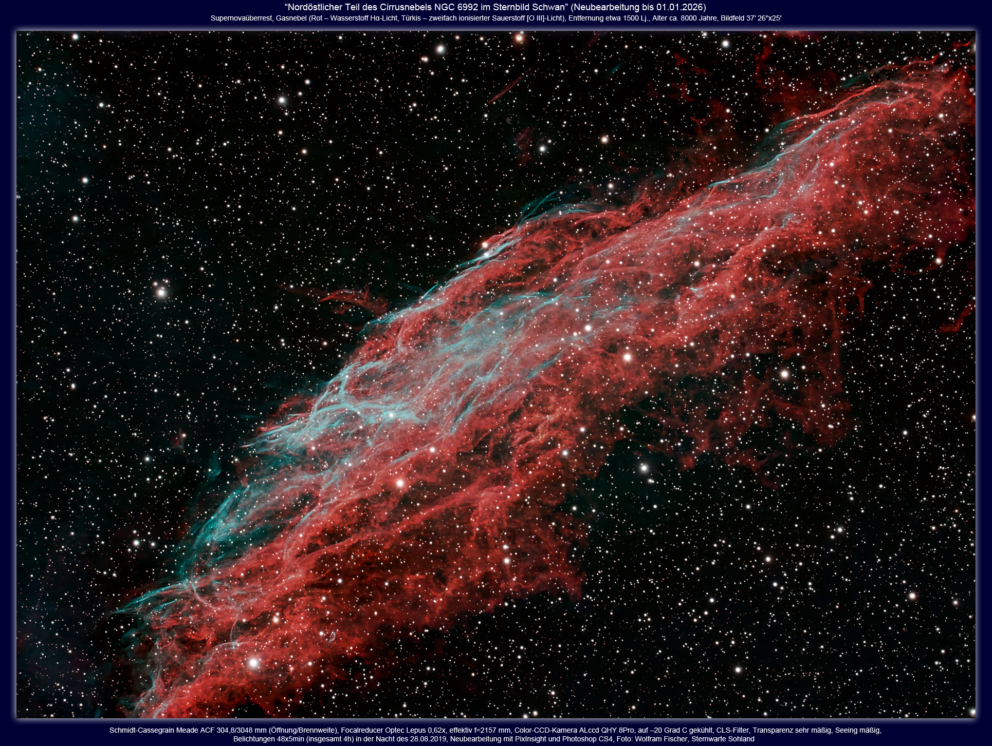 Um den Jahreswechsel versuchte ich eine Neubearbeitung einer Aufnahme des Cirrusnebels NGC 6992 von 08.2019. Durch den Kauf eines Schmalband [O III]-Filters wurde mir bewusst, dass diese Emissionslinien des zweifach ionisierten Sauerstoffs (bei 500,7 und 495,9 nm Wellenlänge) ziemlich grün sind, nur mit einem geringen Blauanteil (Türkis). Dies versuchte ich in meinem Bild wiederzugeben.